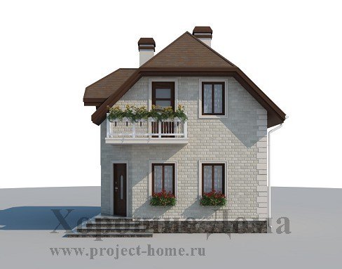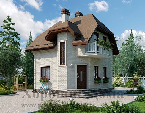 Практичный и несложный в постройке этот коттедж из газобетона имеет площадь всего 53,8 кв. м. Длина его стен по 6 м., что делает его прекрасным решением для малых участков земли. Внешне коттедж оформлен довольно современно и выглядит уютно. Небольшой эркер слева от парадного входа, а так же балкончик второго этажа – справа, придают уникальную изюминку проекту.