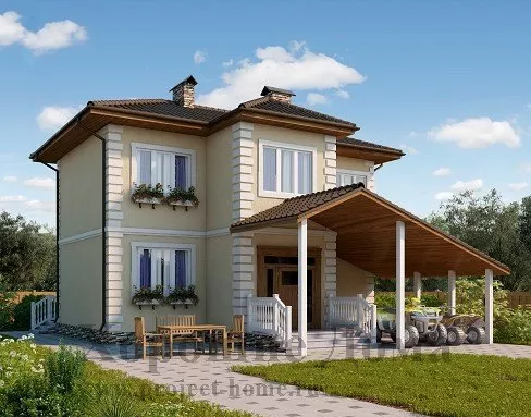 Проект дома из газобетона на 116 кв. м с эркером и навесом для авто