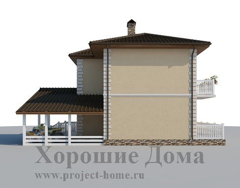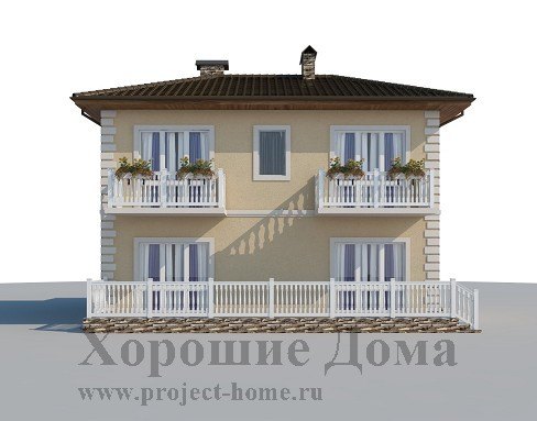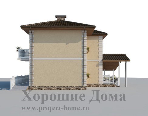 Отделка фасада – декоративная штукатурка с элементами декора, отделка цоколя – природный камень.