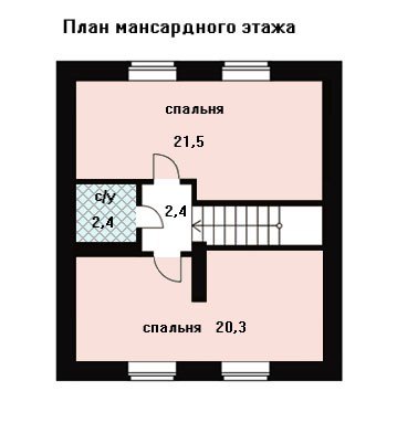 Планировка внутреннего пространства дома также проста и логична. Большую часть площади первого этажа занимает светлая гостиная, из которой есть выход на кухню. В центре гостиной предусмотрено место для установки камина, а лестница в углу помещения приводит нас на второй этаж, мансардный, пространство которого поделено между двумя просторными спальнями и небольшим санузлом. Площади спален позволяют оборудовать в них встроенные гардеробные шкафы.