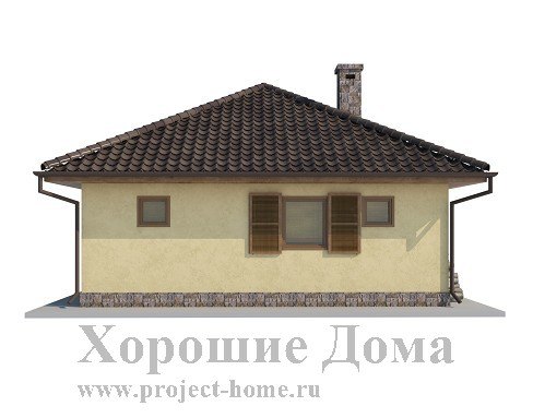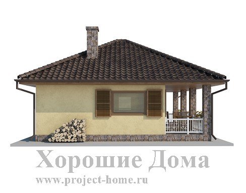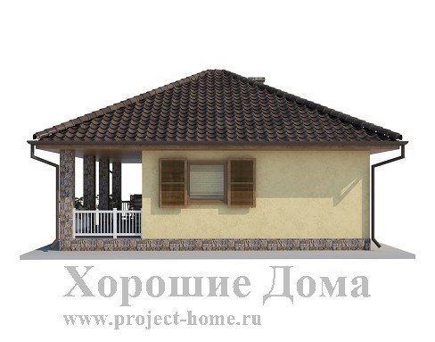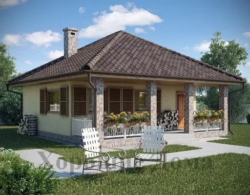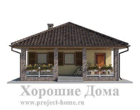 Небольшой по площади, всего 48,35 кв. м., приятный внешне этот загородный коттедж станет отличным временным приютом для небольшой компании. Коттедж по плану имеет практически равные стороны длиной по 7,5 м, включая веранду и представляя собой форму квадрата. Аккуратно оформленное крытое крыльцо, протянувшееся вдоль всей передней стены дома, выглядит довольно гостеприимно, благодаря четырем квадратным колоннам, предваряющим вход в коттедж. Оно отлично подойдет для хранения дров, велосипедов, санок и прочей домашней утвари, которой нет места в самом особняке.