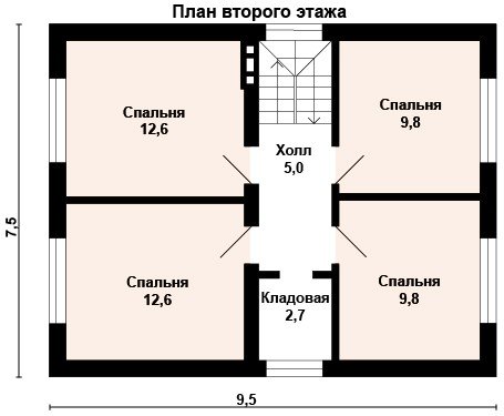 По лестнице, находящейся в уютном холле, попадаем на второй этаж, поделённый на четыре спальни. Между спальнями находится небольшая кладовая, которая может использоваться и как гардероб.