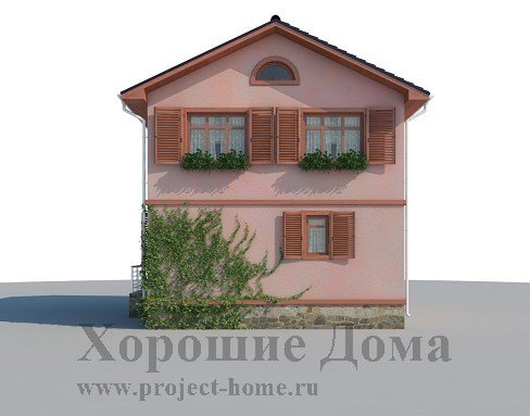Колоритный двухэтажный загородный дом, с явно выраженным цельным объёмом, прямыми фасадами, оригинальными деревянными ставнями, придающими внешнему облику дома особую выразительность. Дом небольшой площади, очень компактный и экономичный, рассчитан на проживание в тёплое время года небольшой семьи из 2-5 человек.