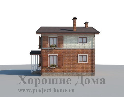 Двухэтажный загородный дом в классическом стиле, с явно выраженным цельным объёмом, выразительной отделкой фасада, оттенённой эффектными деревянными ставнями. Главный вход в дом чётко обозначен и оформлен в виде изящного портала с колоннами.
