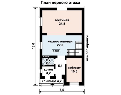 Планировка дома проста и рациональна. Зоны коридоров минимальны. На первом этаже находится зона дневного пребывания - это просторная кухня, совмещённая со столовой и объединённая общим пространством с кухней. Также на первом этаже находятся кабинет, котельная и санузел.