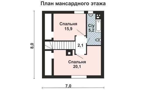 Лестница в углу гостиной ведёт на мансардный этаж, где удобно разместились две просторные спальни и ванная комната.