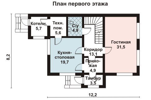 В коттедже не предусмотрен цокольный этаж, поэтому котельная и техническое помещение размещены на первом этаже, при том, что вход оборудован, как с улицы, так и изнутри дома. Первый этаж так же вмещает в себя достаточно просторную кухню-столовую, размер которой составляет 19,7 кв. м., а так же гостиную комнату - 31,5 кв. м. В особняке по проекту находится два санузла размещенных на первом и втором этажах. Площадь каждого из них не превышает 6 кв. м.
