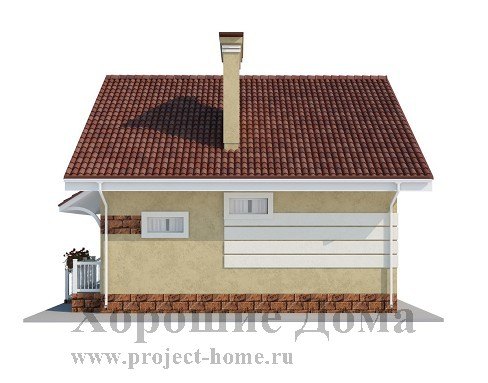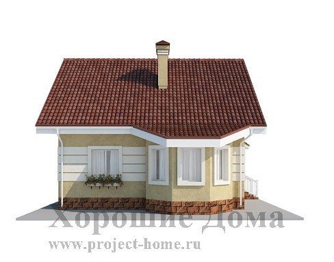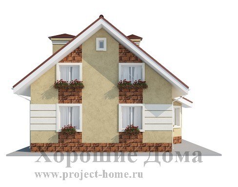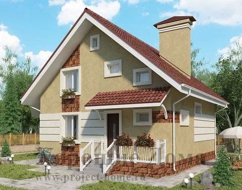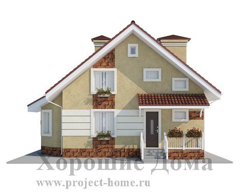 Очень симпатичный, уютный загородный коттедж в деревенском стиле для проживания в теплое время года небольшой семьи из 2-4 человек. Проект компактен, экономичен, с возможностью круглогодичного проживания при условии установки отопительного газового котла в помещении санузла на первом этаже. Остроконечная двухскатная крыша, оригинальная отделка фасада с использованием элементов декора и фрагментов из натурального камня, выразительные окна придают дому неповторимый сельский колорит.