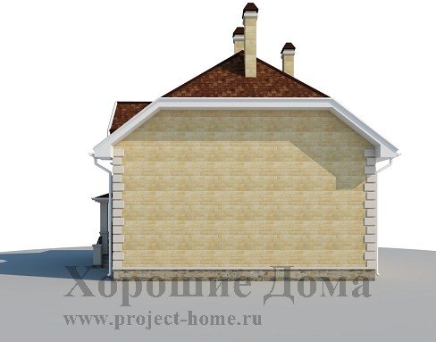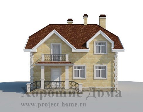 Оригинальный проект небольшого загородного дома привлекает не только своей экономичностью в свете финансовых затрат на строительство. Его отличает респектабельный внешний вид и высокий уровень комфорта благодаря очень удобной и рациональной планировке внутреннего пространства. Особую выразительность внешнему облику дома придают стройные пилоны на входе, ажурные кованые перила крыльца и балкона, эффектная многоскатная крыша с выступающими элементами архитектурного декора.
