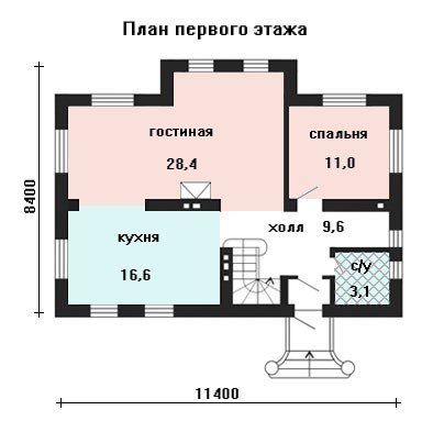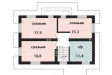 Площадь дома невелика, что положительно сказывается на снижении финансовых затрат на строительство. Планировка дома очень функциональная и логичная. Большая часть первого этажа представляет собой единое пространство для дневного пребывания. Это кухня, совмещённая со столовой, и гостиная с большим настоящим камином. Помещение гостиной расширено за счёт прямоугольного эркера. Также на первом этаже имеются гостевая спальня и санузел.