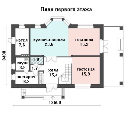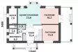 Парадный вход в дом предваряет просторное крыльцо с небольшой лестницей. Из большого холла площадью 15,4 кв. м. можно попасть во все жилые помещения первого этажа и на лестницу, ведущую на второй этаж. Самым большим помещением в доме является гостиная комната – 16,2 кв. м., которая полностью совмещена с кухней-гостиной – 23,6 кв. м. Приятным дизайнерским решением тут является наличие эркера, куда отлично встанет большой обеденный стол.