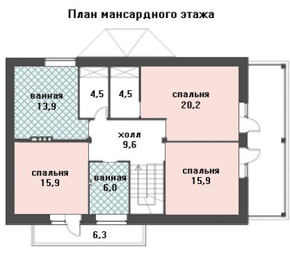 Назначение мансардного этажа исключительно в качестве спальной зоны. Здесь размещены три просторные спальни и так же довольно большой общий санузел.