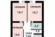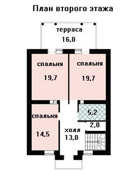 Второй этаж представляет спальную зону с одной ванной комнатой и тремя спальнями 14,5 кв. м. и две по 19,7 кв. м.