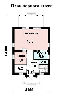 Первый этаж предлагает большую гостиную комнату с домашним камином и собственным выходом на придомовую террасу. К парадному входу в особняк можно попасть через крылечко, особое очарование которому придают две колонны. Одним из плюсов данной планировки можно считать наличие отдельной комнаты для размещения гостей, а так же большой кладовой комнаты.