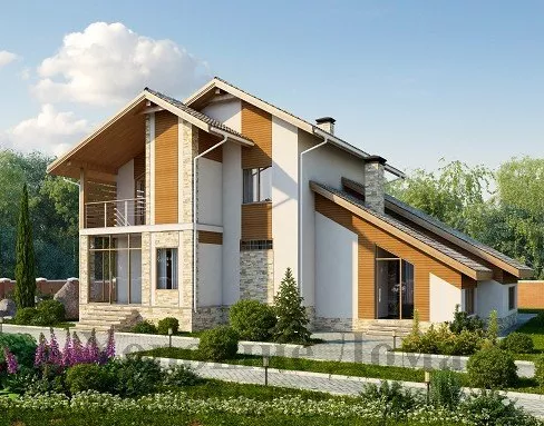 Оригинальная отделка фасада включает в себя отделку природным камнем, декоративную штукатурку и элементы архитектурного декора из дерева. Двухскатная двухуровневая крыша покрыта металлочерепицей.