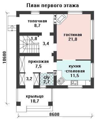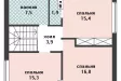Площадь первого этажа поделена на две равные части. В одной находятся просторная гостиная с большим угловым камином и кухня, соединённые между собой арочным проёмом. В другой части первого этажа расположены котельная, прихожая с встроенными шкафами, санузел и лестница, ведущая в мансарду.