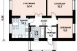 В большой зал площадью 22,4 кв. м. можно попасть из широкого холла, ведущего во все помещения в доме. Рядом с залом запроектирована спальная комната размером 16,7 кв. м., имеющая общую стену со второй спальней площадью поменьше – 9,8 кв. м., которая может быть перепланирована под рабочий кабинет или детскую комнату. Размеры кухни, замыкающей холл слева, составляют 10,9 кв. м., а размещенного рядом с ней санузла – 5,4 кв. м. Планировка дома выглядит достаточно просторной и хорошо продуманной, позволяя беспрепятственно и, главное, быстро попадать во все помещения особняка.