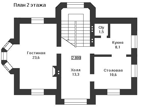 Широкая светлая лестница из холла ведёт на второй этаж с чётким зонированием. Левая половина второго этажа - это просторная гостиная, украшением которой является эркер и камин. Правая половина этажа отводится помещениям кухни и столовой.