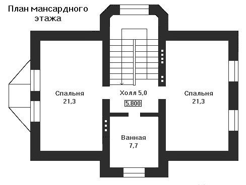 На мансардном этаже по обе стороны от холла находятся две симметрично расположенные спальни-близнецы, просторные, с возможностью оборудования в них гардеробных комнат. Между спальнями расположена ванная комната.