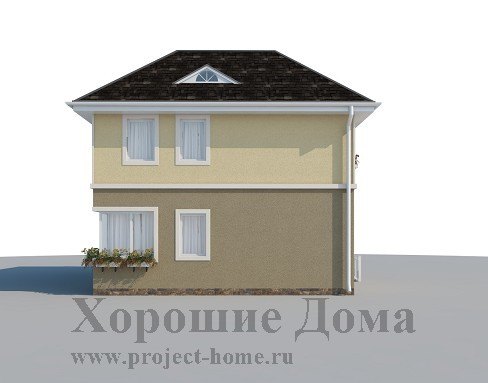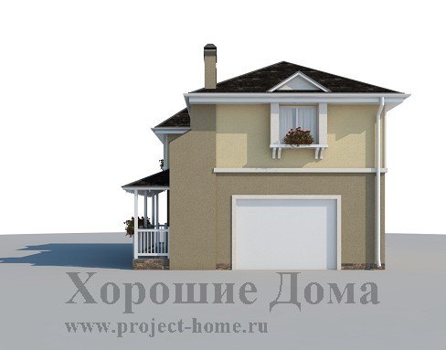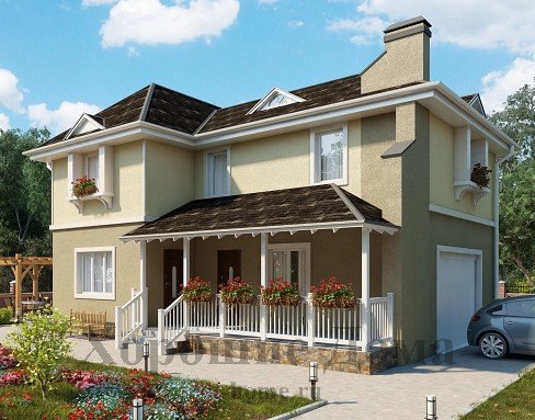 Стильный особняк в стиле современных загородных коттеджей, предназначенный для проведения летнего времени небольшой семьей численностью до трех человек. Дом двухуровневый, с уютной крытой террасой на входе, оригинальными окнами, многоскатной крышей с чердаком, большим гаражом на две автомашины, который занимает основную часть территории первого этажа - 35,4 кв. м. и позволяет разместить помимо машин и немалое количество автомобильных принадлежностей. Остальная площадь – это единое пространство с функциональностью и кухни, и столовой, и даже гостиной, откуда по лестнице, расположенной в углу общего помещения, можно попасть на территорию второго этажа.