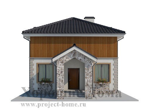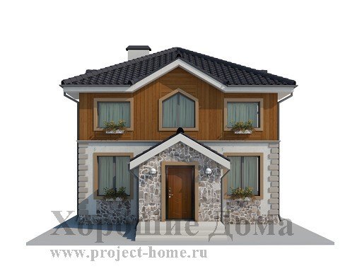 Двухэтажный загородный дом для проживания в теплое время года, очень рациональный, с эффективными конструкциями и лаконичным фасадом. Проект очень экономичный благодаря простым планам, позволяющим значительно сократить расходы материалов. Главный вход выполнен в виде небольшого тамбура. С тыльной стороны дома имеется небольшая закрытая терраса с выходом в сад.