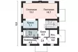 Планировка дома также очень проста и рациональна, пространство коридоров минимально. Основную часть площади первого этажа занимают кухня-столовая и гостиная. Столовая и гостиная представляют собой единое логическое пространство. Из гостиной есть выход в сад. Также на этаже нашлось место для хозяйственных помещений и санузла.