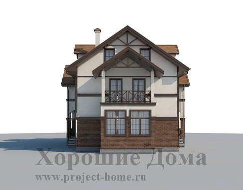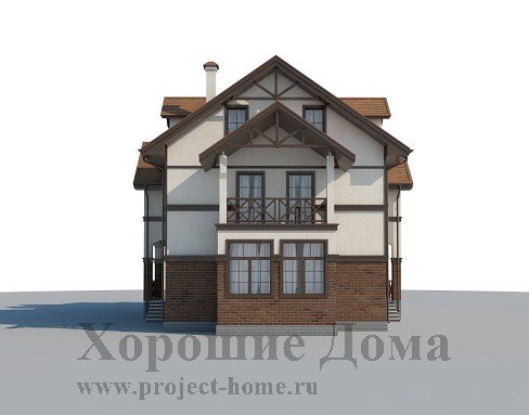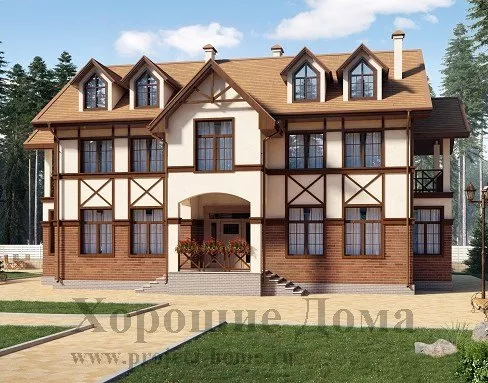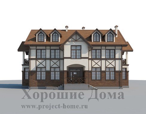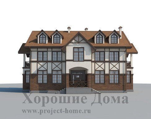 Солидный загородный особняк в традициях американского колониального стиля, очень бюджетный, с двумя отдельными входами, оформленными высоким крыльцом с мощными пилонами, поддерживающими нависающий объём эркера. В доме зеркальное расположение комнат, он может стать удачным вариантом для летнего отдыха двух семей или для небольшой семейной мини-гостиницы.