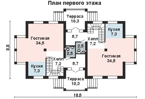 На первом этаже каждой из половин особняка размещены кухня, просторная гостиная и холл. Гостиная находится в помещении с просторным эркером, в котором можно установить обеденный стол, так как отдельного помещения под столовую проектом не предусмотрено.