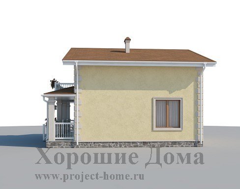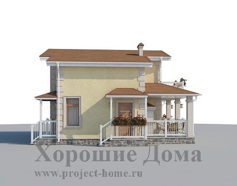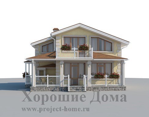 Эффектный двухэтажный загородный коттедж с выразительным фасадом, солидно оформленной белоснежными колоннами просторной крытой террасой предназначен для сезонного проживания небольшой семьи в составе 2-5 человек. При условии установки газового отопительного котла в помещении кладовой справа от главного входа дом может использоваться круглогодично.