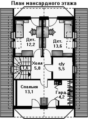 В дополнение на территории первого этажа имеются санитарный узел, помещение для бытовых нужд, уютный холл, из которого по лестнице можно попасть на территорию мансарды, где плотно друг к другу разместились три комнаты, предусмотренные под спальни с персональными выходами на балконы, а так же общий санитарный узел. Спальня хозяев коттеджа оборудована отдельной коматой под гардероб.