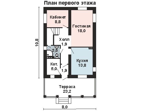 Площадь особняка невелика, но очень удобно и логично спланирована. На первом этаже находятся помещения котельной, кухни, просторной гостиной и кабинет. В гостиной предусмотрена возможность установки настоящего камина.
