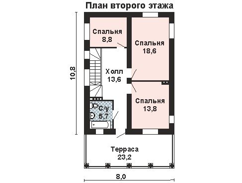 Из небольшого холла первого этажа по лестнице попадаем в просторный холл на втором, где находятся три разновеликие по площади спальни и ванная комната. Из холла имеется выход на террасу.
