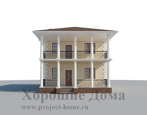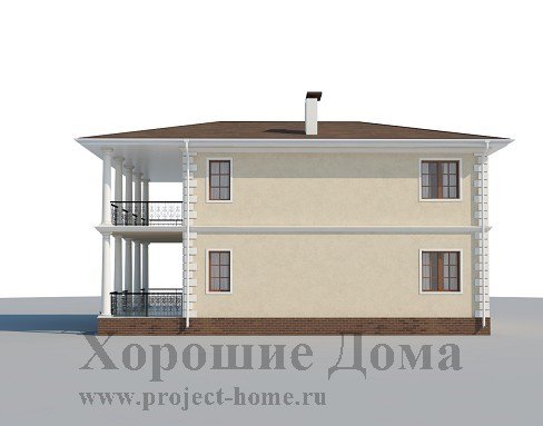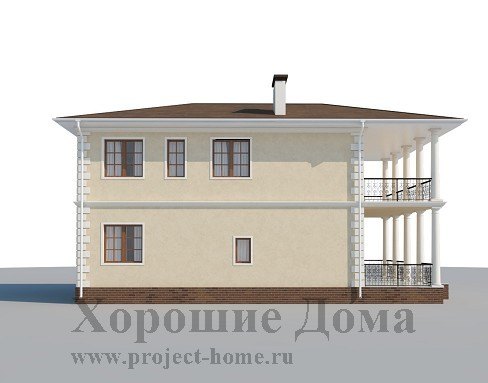 Отделка фасада - декоративная штукатурка с элементами декора; террасы украшены коваными ажурными перилами.