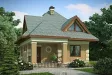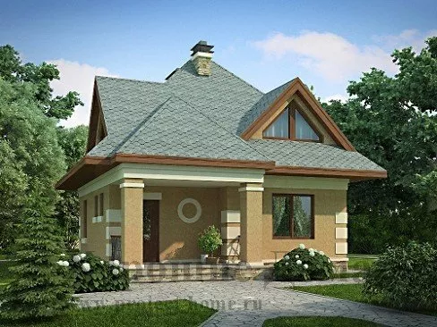 Очень экономичный, уютный загородный дом, не требующий под застройку участок большой площади, органично вписывающийся в окружающий природный ландшафт. Особую выразительность внешнему облику дома придают массивные пилоны на входе, поддерживающие объёмное расширение в виде эркера, многоскатная крыша, оригинальные элементы архитектурного декора в виде рустов и карнизов.