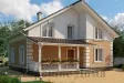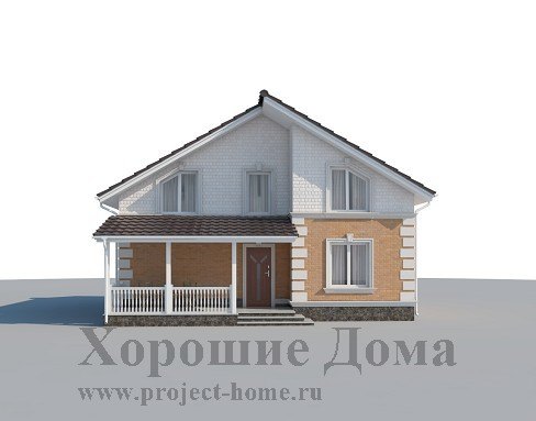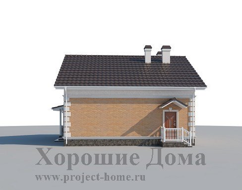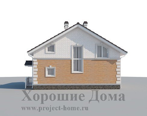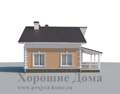 Добротный, уютный и очень компактный загородный коттедж с выразительным оформлением фасада, простой двухскатной крышей и оригинальными окнами станет удачным решением в выборе дома для небольшой семьи в составе двух-четырех человек.
