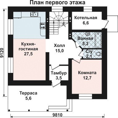 Планировка внутреннего пространства дома отличается чётким зонированием. Просторный холл с лестницей, ведущей на мансардный этаж, делит помещение первого этажа на две половины. Левая половина - это единое целое пространство кухни, столовой и гостиной. На правой половине разместились гостевая спальня, ванная комната с санузлом и котельная, имеющая отдельный вход со двора.