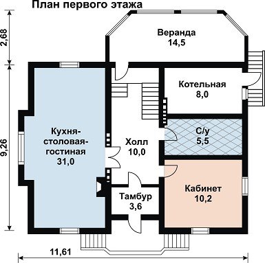 Привлекающий внешней гармонией, простым и органичным дизайном коттедж из газобетона площадью 162,4 кв. м. является одним из наилучших решений при поиске городского особняка для одной семьи. Лаконичная планировка каждого метра добавляет этому проекту очарования и привлекательности. Особняк имеет два этажа и просторную застекленную веранду, отлично подходящую под оформление зимнего сада. Дом поделен на две части просторным длинным холлом размером 10 кв. м. и завершающимся выходом на веранду. Левая часть по проекту принадлежит гостиной, кухне и столовой, составляющим одно неразделенное пространство площадью 31 кв. м. Правая сторона дома разбита между небольшим рабочим кабинетом размером 10,2 кв. м., просторным санузлом и довольно большой котельной, вход в которую осуществляется с улицы.