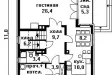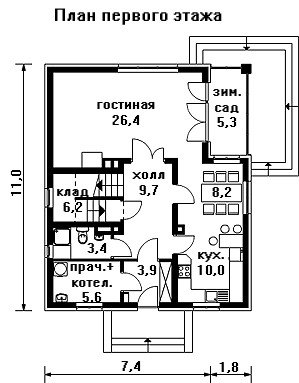 При планировке первого этажа учитывались все нужды современной городской семьи. Так, гостиная комната довольно большая и занимает площадь в 26,4 кв. м. Она имеет собственный выход в небольшой зимний сад размером 5,3 кв. м. Кухня совмещена со столовой и размещается на территории в 10 кв. м., а напротив нее через холл расположены такие бытовые помещения, как санузел, кладовая, прачечная и котельная.