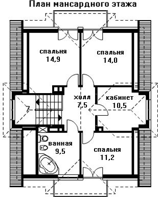 Второй, мансардный, этаж является полностью спальной зоной с тремя спальнями и дополнительной небольшой комнатой в 10,5 кв. м., где можно разместить кабинет или любое другое помещение на вкус хозяев.