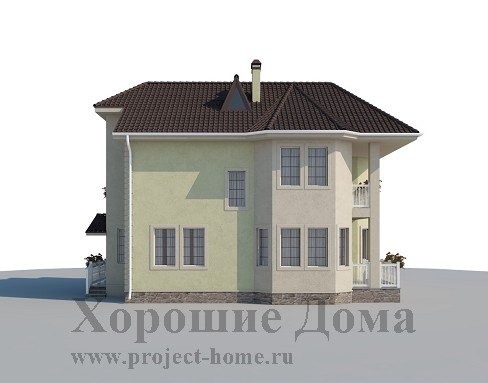 Проект очаровательного двухэтажного коттеджа площадью 155,5 кв. м. отлично подойдет для воплощения не только в сельской местности, но и в городе. Аккуратное оформление экстерьера понравится любителям домашнего уюта. К парадному входу в дом можно попасть через небольшое крыльцо. Войдя можно практически сразу пройти в гостиную комнату, имеющую по одной из стен небольшой овальный эркер. К гостиной примыкает кухня-столовая размером 18,1 кв. м. Плюсом данной планировки является наличие дополнительной гостевой комнаты на первом этаже, расположенной практически у парадного входа, что позволяет гостям свободно входить и покидать дом, не мешая хозяевам дома.