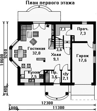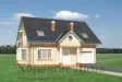 На первом этаже дома находится зона для дневного пребывания обитателей дома в виде единого пространства, поделенного на зоны кухни, столовой и гостиной. Зона столовой выделяется уютным эркером, украшением гостиной комнаты является большой камин. Также на первом этаже разместился гараж на одну автомашину и помещения хозяйственно-бытового назначения.