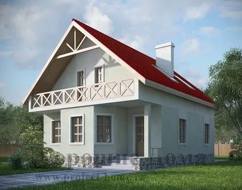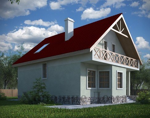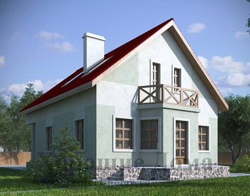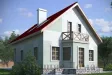 Передний фасад с глубоким расположенным в центре эркером, который одновременно является балконом, смотрится вполне выразительно. Парадный вход удобно выполнен с крытого крыльца.