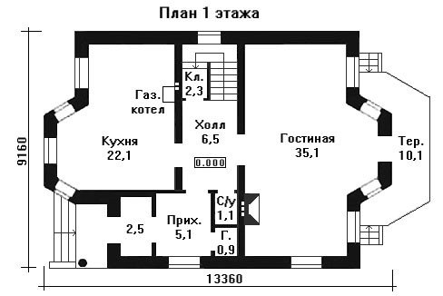Обширная прихожая незаметно преобразуется в комфортабельный холл с удобной лестницей, разделяя дом на практически равные половины. В левой части, с эркером, украшающим главный фасад, размещена кухня-столовая, а в правой, с эркером, обращённым в сторону участка, находится гостиная с домашним камином.