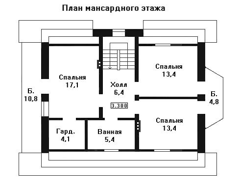 Мансарда отдана под три спальни, гардероб и санитарный узел. Каждая спальня оборудована выходом на балкон.