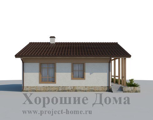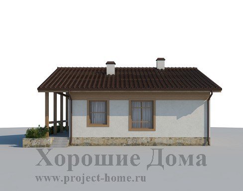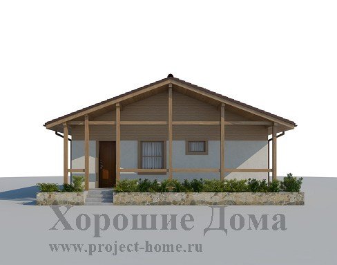 Вход в дом предваряет широкое крыльцо, протянувшееся вдоль все передней стены коттеджа. Важно, что внутренняя планировка по проекту данного особняка может быть спроектирована и по индивидуальному вкусу хозяина.