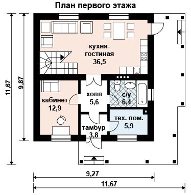 Внутренний объём дома тщательно и логично спланирован. Площадь коридоров сведена до минимума. На первом этаже половину площади занимает единое пространство кухни-столовой-гостиной. В углу гостиной находится лестница, ведущая на второй этаж. Из столовой можно попасть на террасу. Также на первом этаже по разные стороны от небольшого холла расположены рабочий кабинет, санузел и техническое помещение, в котором в случае круглогодичного использования дома может быть оборудована котельная.