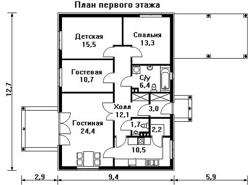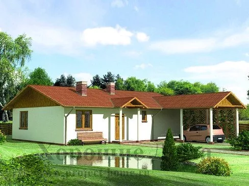 Внутренняя планировка способствует комфортному и приятному отдыху. В левом крыле дома расположена зона дневного пребывания, это кухня и гостиная-столовая, из которой имеется выход на крытую террасу. В холле предусмотрены ниши для встроенных шкафов. Правое крыло дома – это приватная зона, где находятся три уютные спальни и ванная комната.