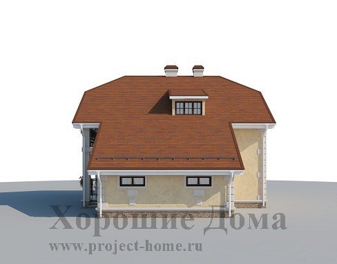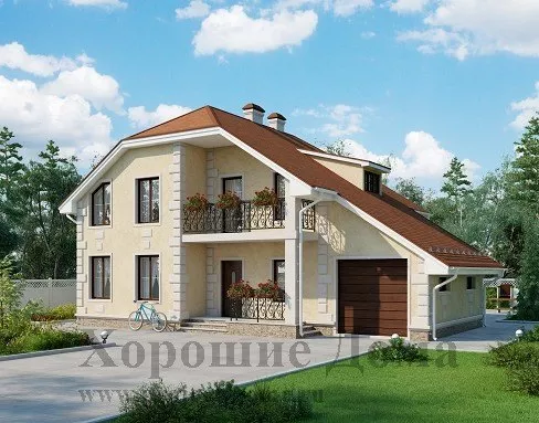 Оригинальный проект особняка из газобетона площадью 166,5 кв. м. прекрасно подходящего для проживания в городе. Дом экономичен в постройке и предлагает все, что нужно для комфортного постоянного проживания семьи. Гараж, рассчитанный на один автомобиль, имеет территорию в 18,2 кв. м. и примыкает к основному зданию справа. Из гаража оборудован отдельный выход в холл дома откуда можно попасть во все помещения первого этажа. Планировка коттеджа проста и логична. На первом этаже предусмотрена гостиная комната, совмещенная с кухней-столовой и довольно большой кабинет. Помимо санузла первого этажа тут имеется небольшая сауна.