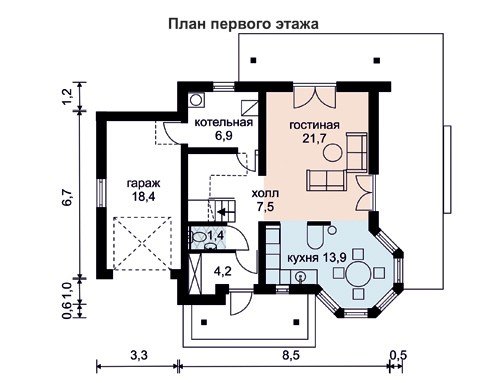 Внутреннее пространство дома очень логично спланировано для создания максимального уровня удобств и уюта его обитателей. Зона дневного пребывания на первом этаже состоит из единого пространства кухни, столовой и гостиной. Настоящим украшением первого этажа является эффектный пятигранный эркер, в котором удобно разместился обеденный стол. Из гостиной имеются два выхода на террасу. Помещение гаража на одну автомашину выполнено в виде пристройки к основному объёму здания.