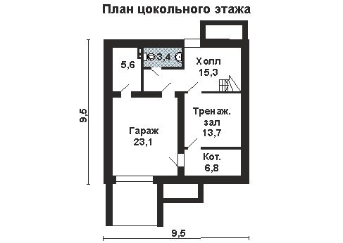 Цокольный этаж включает в себя подземный гараж площадью 23,1 кв. м., а так же помещение котельной, санузел, тренажерный зал и дополнительное небольшое помещение свободного назначения. На первом этаже компактно расположены самые необходимые комнаты, это гостиная 21,3 кв. м. и кухня – 16,1 кв. м. Кроме того тут же находятся санузел и помещение гардеробной площадью 5,7 кв. м. На второй этаж ведет просторная лестница из довольно большого холла размером 13,8 кв. м., где размещены три спальных комнаты и один большой общий санузел.